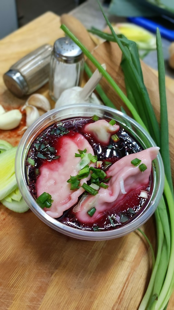 Syty kubek maly (4 pierogi z mięsem w barszczu)
